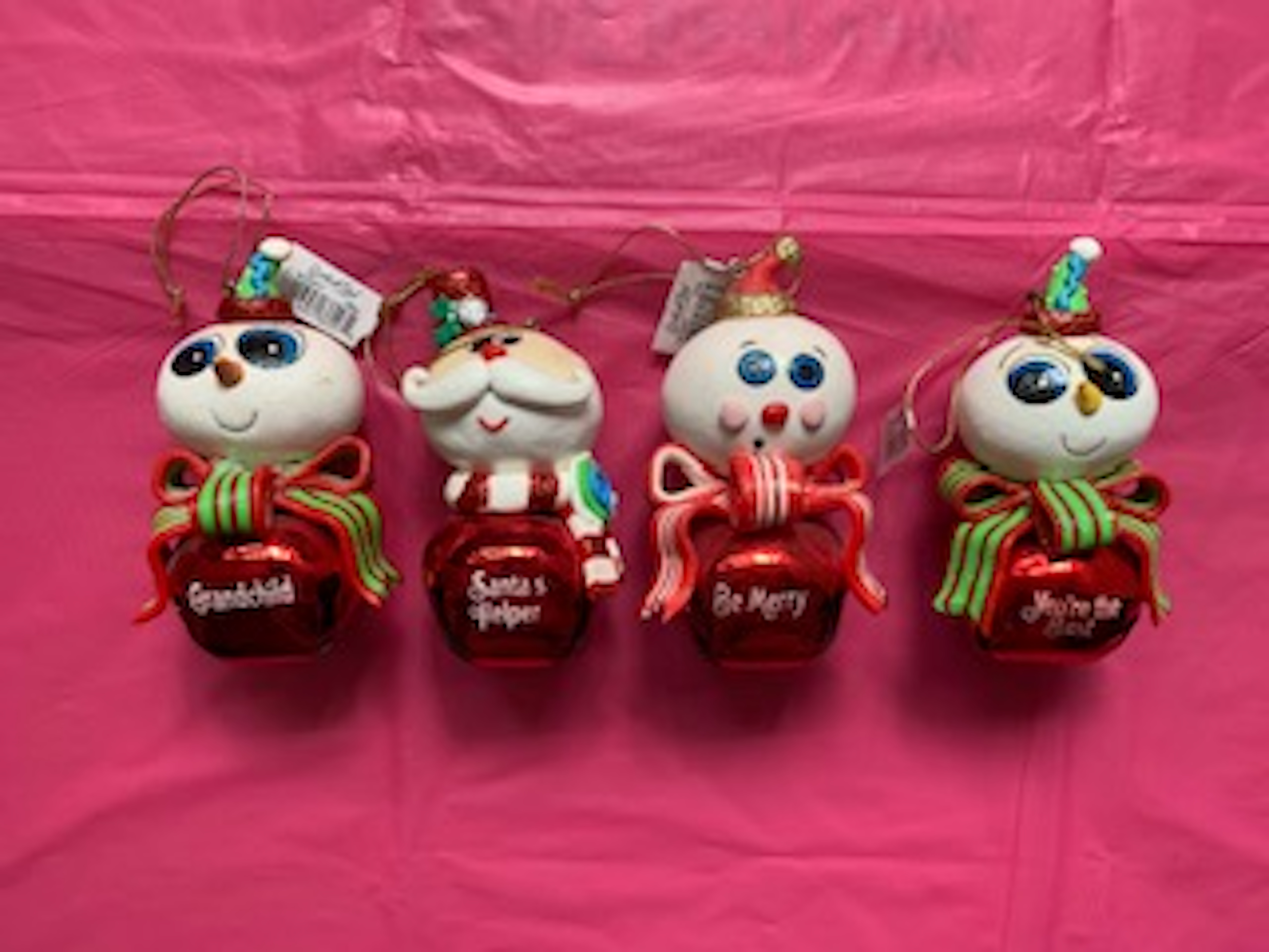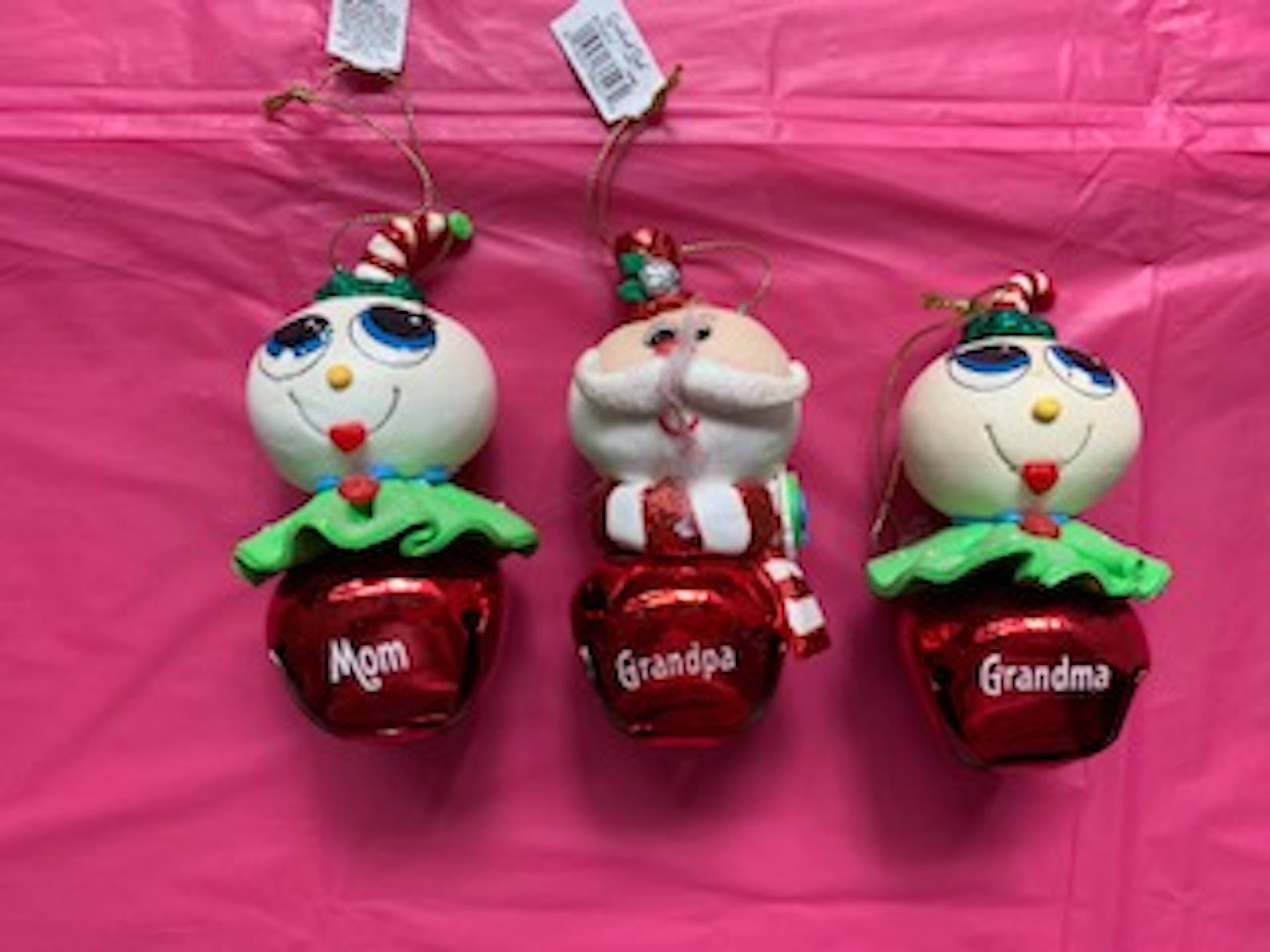 Cartoon Jingle Bell Character Christmas ornament measures 4 inches tall and features a collection of family members with a red metal jingle bell body, an enchanting snow person head and a title printed across the middle. Choose from ten styles.